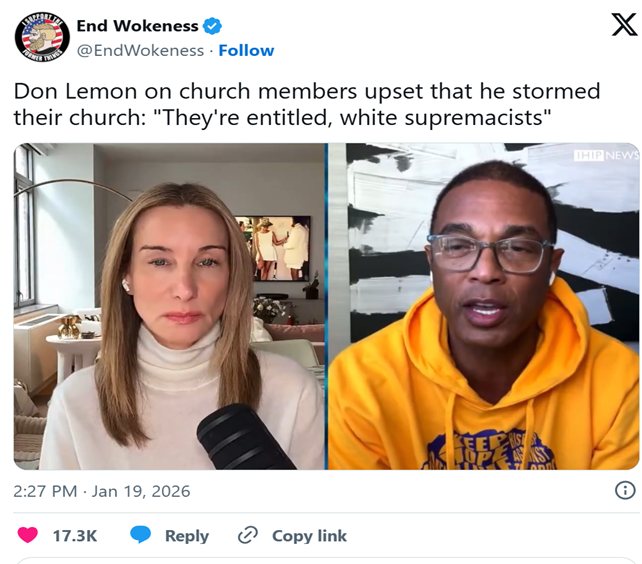 On Sunday, Don Lemon and a group of radical, anti-ICE left-wing extremists stormed a Minneapolis church. They barreled into a house of worship while families with young children were praying and proceeded to harass and intimidate congregants based on supposed “intel” that someone connected to the church had ties to ICE.