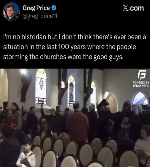 Minneapolis. Sunday, January 18th. More organized mayhem. A mob, led by Black Lives Matter organizers and encouraged by a video posted on social media, stormed into an area church during a service. Inside the sanctuary of Cities Church, agitators loudly chanted “Justice for Renee Good.”
