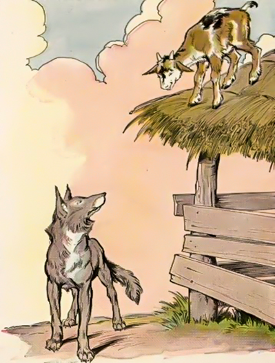 A frisky young Kid had been left by the herdsman on the thatched roof of a sheep shelter to keep him out of harm’s way. The Kid was browsing near the edge of the roof, when he spied a Wolf and began to jeer at him, making faces and abusing him to his heart’s content.