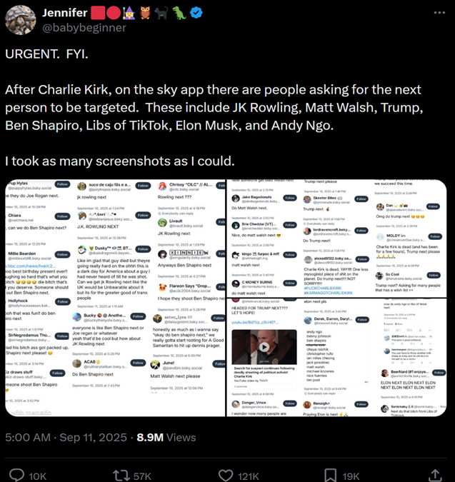 And it doesn’t stop there. The mob on Bluesky is now taking it even further by openly naming other conservatives they want to see assassinated next. Like this is some kind of “Hunger Games” to them.