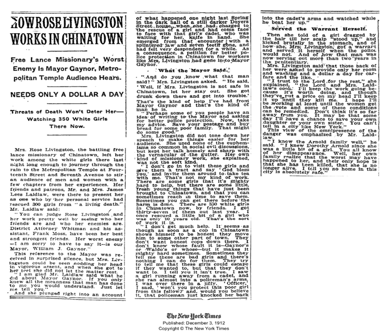 - “How Rose Livingston Works In Chinatown. Free Lance Missionary’s Worst Enemy Is Mayor Gaynor, Metropolitan Temple Audience Hears” (PDF), The New York Times, December 3, 1912