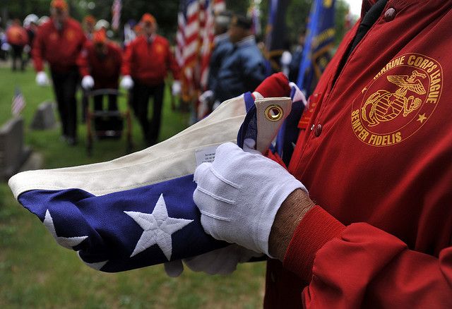 The flag ceremony began. White gloved hands unfolded the American flag. Two vets held the corners of the flag, keeping it from ever touching the ground. Unfolded the flag was hoisted to the top of the nearby flag pole. My father, placing his hand over his heart, began: “I pledge allegiance to the flag…” I could see that the Stars and Stripes, at ease on this serene morning, moved the veteran’s hearts to their throats, pushing tears into their eyes. There were no placards of “Make Love Not War” here this morning. The bearers of those signs must have been sleeping in, secure in their beds.