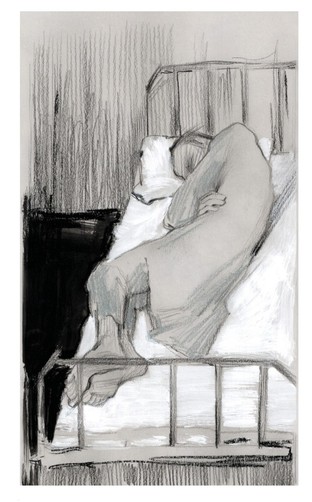 “The beds in the room are bolted to the floor. Sitting and lying on them are men in blue hospital dressing gowns, wearing nightcaps in the old style. These are the lunatics.