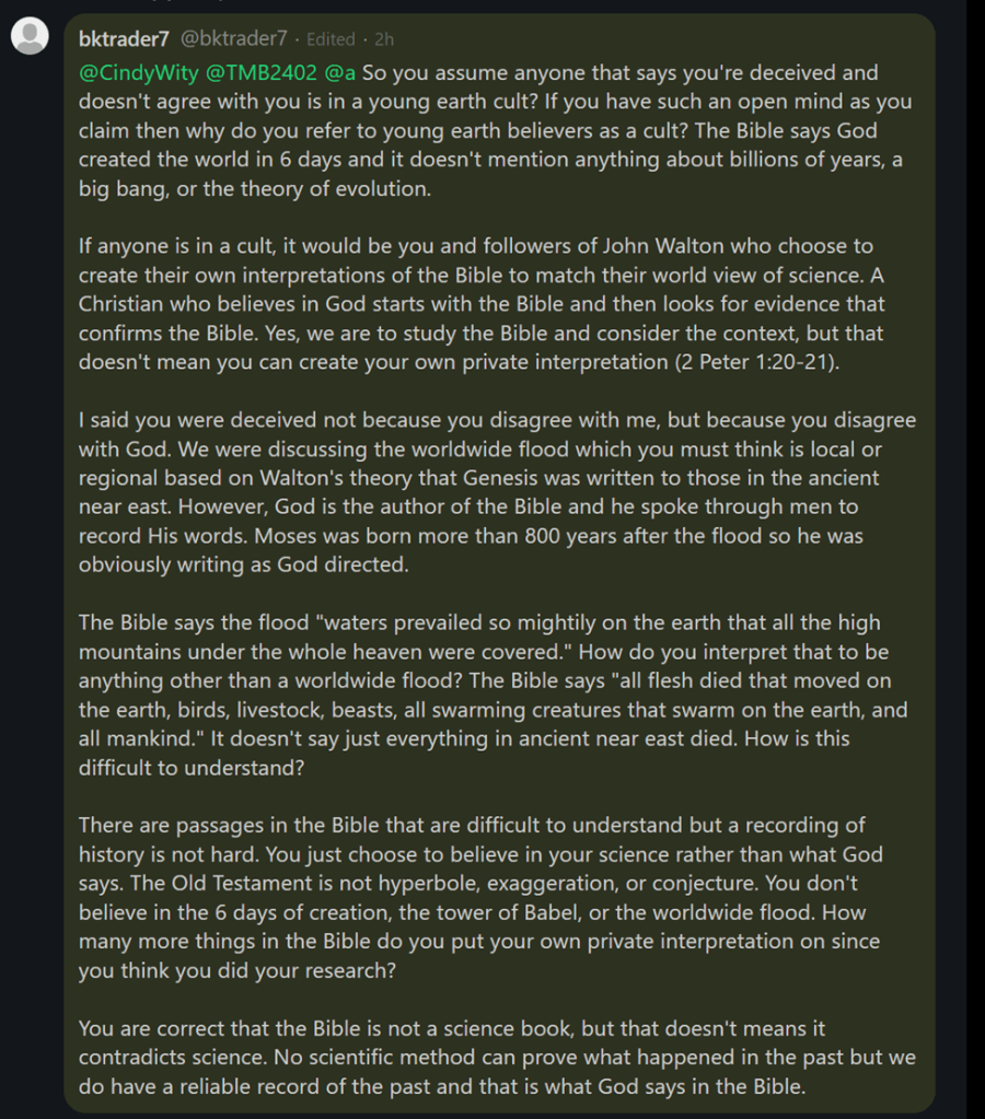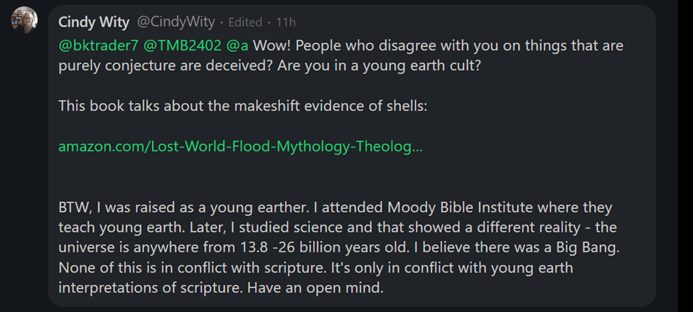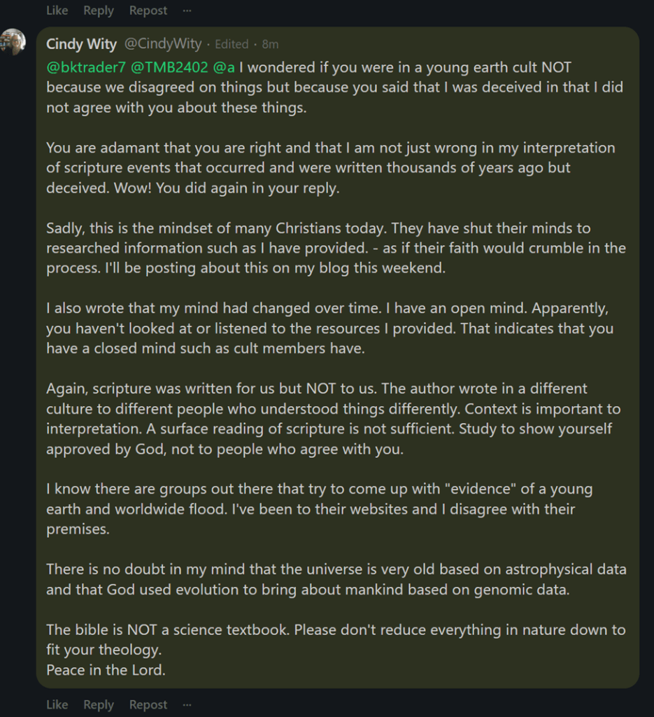 When I told my eighty-nine-year-old Godly mother that, based on research, I believed the universe to be billions of years old and that God used evolution, she didn’t reply “That’s interesting. Tell me more.” She said “That’s heresy!” Her defense mechanism alarm bell went off. She was reacting from what she had been taught and how she had been taught to think about what she was taught.
