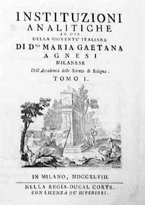 In 1748 Maria she publishes a mathematical treatise, Analytical Institutions for the Use of Italian Youth. It is so impressive – regarded by those in the field as the best introduction extant to the works of Euler – that it earns her a professorship in mathematics and physics at the University of Bologna; she becomes only the second woman ever to be awarded such a position.