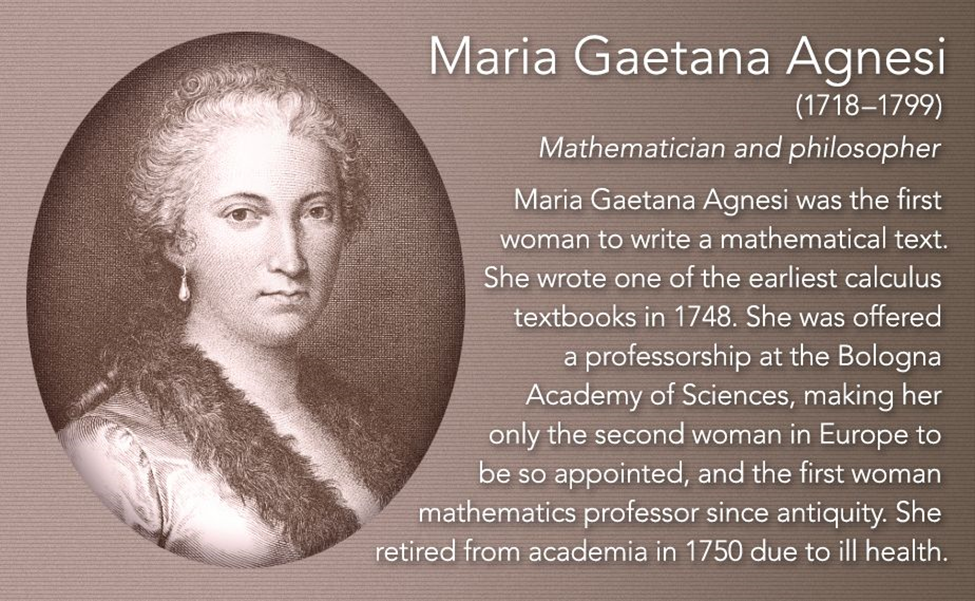 Have you heard of the first woman to write a mathematics handbook – Analytical Institutions for the Use of Italian Youth – and also the second woman awarded a professorship in mathematics and physics at the University of Bologna after publishing her calculus textbook?