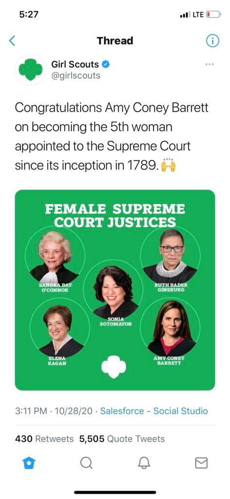 After Justice Barrett was sworn in, the Girl Scouts of America congratulated her on their Twitter and Facebook pages. But the posts were quickly deleted after social media erupted and began spewing vitriol against “the 5th woman appointed to the Supreme Court since its inception in 1789.”