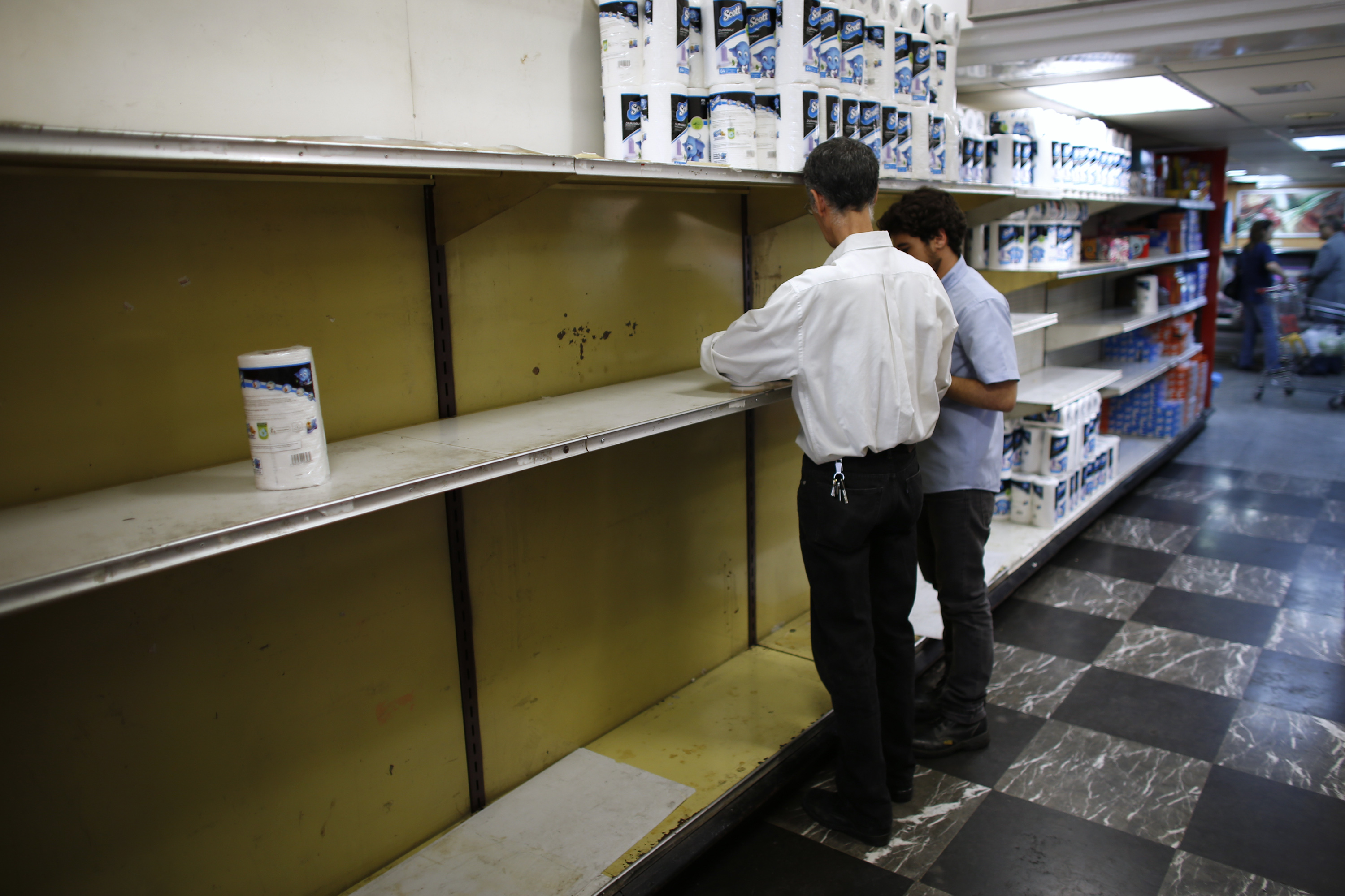 Supermarket staff work next to partially empty shelves of toilet paper in Caracas May 16, 2013. Supplies of food and other basic products have been patchy in recent months, with long queues forming at supermarkets and rushes occurring when there is news of a new stock arrival. The situation has spawned jokes among Venezuelans, particularly over the lack of toilet paper. The government announced this week it was importing 50 million rolls to compensate for “over-demand due to nervous buying.” REUTERS/Jorge Silva (VENEZUELA – Tags: POLITICS BUSINESS) – RTXZPIP