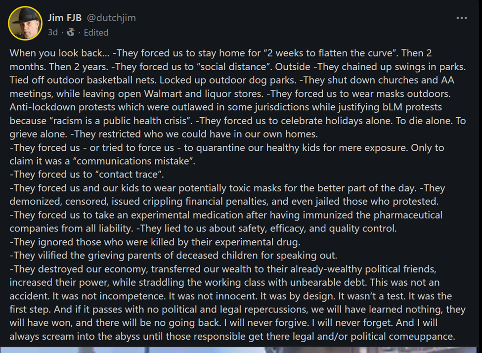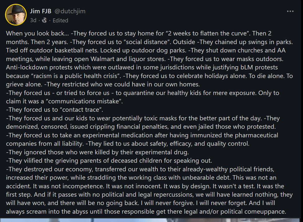 Did you accept the “don’t question the science” COVID package thinking of mandates, masking, social distancing, vaccine passports, isolation camps, vaccine efficacy, and of COVID’s origin lies? America’s COVID Response Was Based on Lies