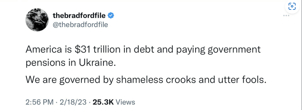 Those of us who pay taxes are the surety behind the U.S. debt that pledges to fulfill its payment obligations in a timely manner. And yet the ruling class treats us like dirt, e.g., sending $100 BN of hard-earned taxpayer money to protect Ukraine’s border and leaving the southern border wide open to all kinds of opportunists (they are NOT refugees).